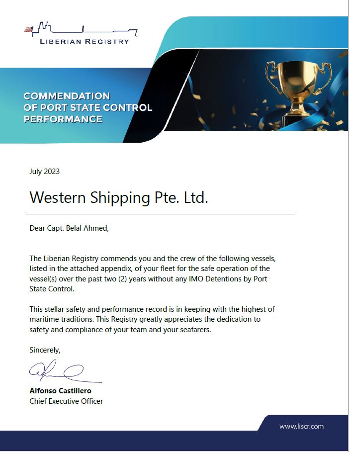 We are pleased to be granted with commendation letter recognizing Western Shipping’s strong PSC performance record under the Liberian flag.